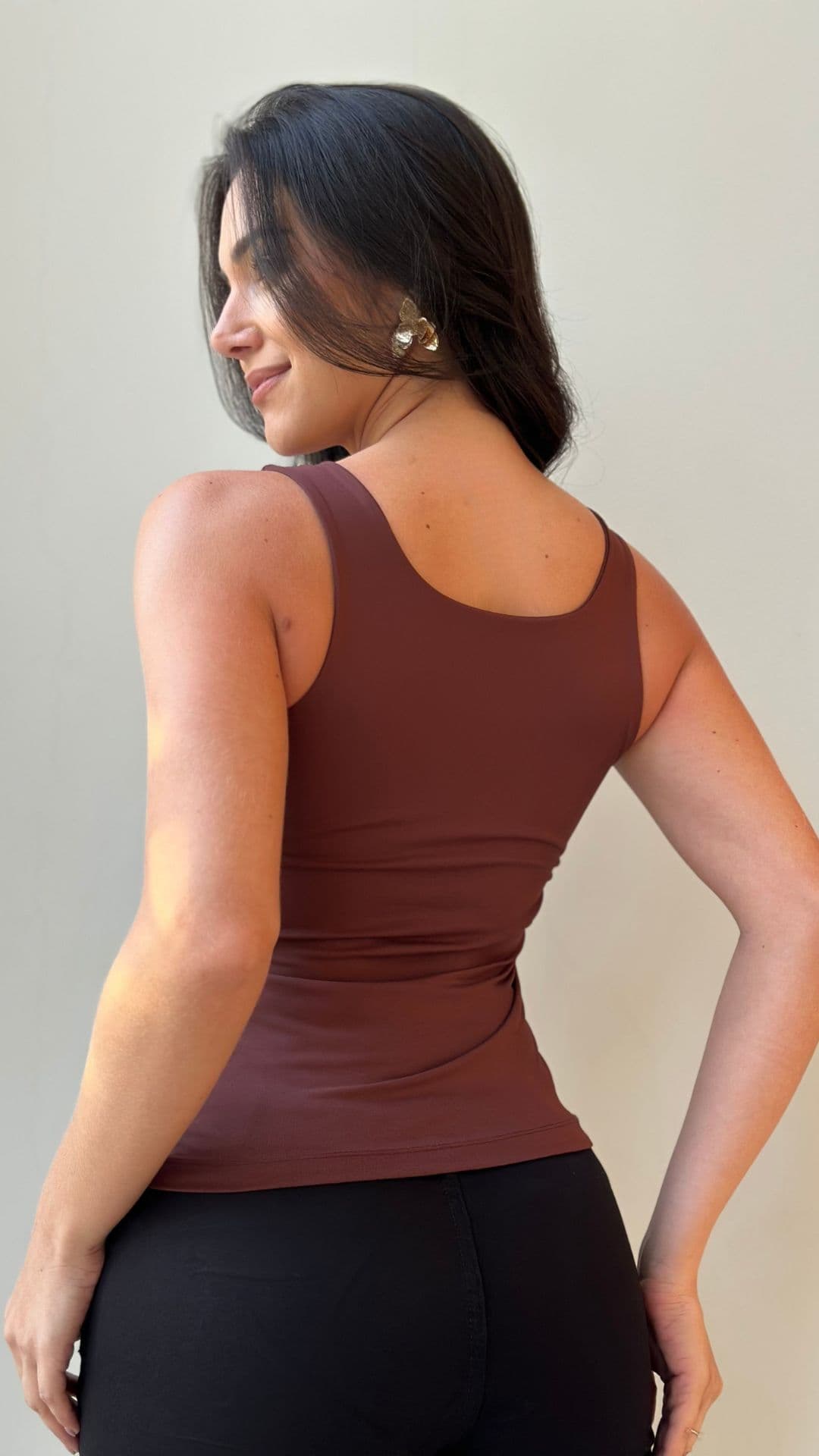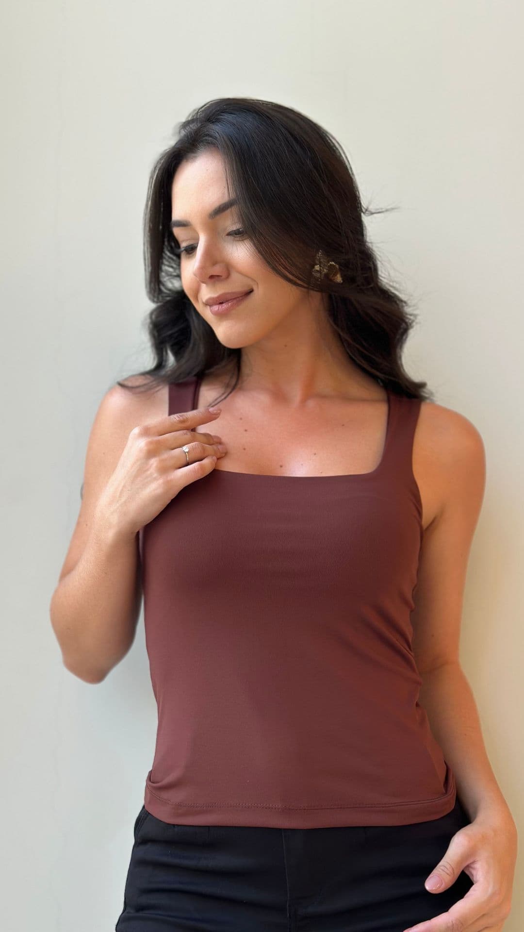 Sem bojo, com alças estilo regata e tecido duplo, garantindo sustentação e acabamento impecável.