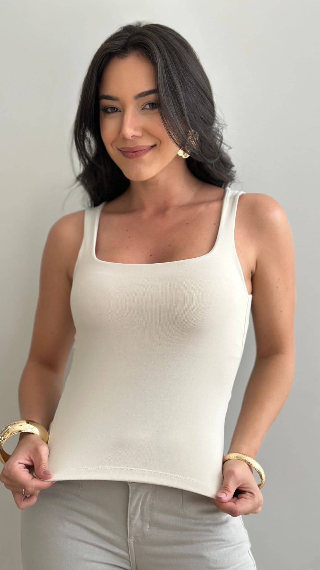 Sem bojo, com alças estilo regata e tecido duplo, garantindo sustentação e acabamento impecável.